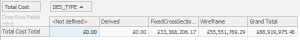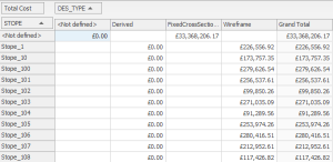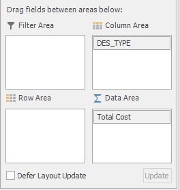 By default (without any additional fields in the Row Area), the total (SUM) of values displays for each table cell. To further categorize your results (say, to show the same total cost information above, by design area, but for each individual stope), add fields to the Row Area, for example: