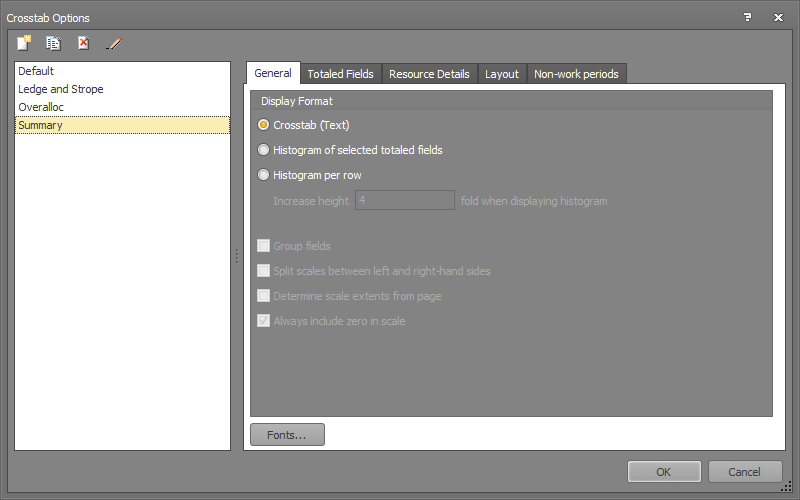 Select this option to display the fields that you selected in the On histogram column of the Totaled Fields tab, on a single histogram chart. If you select this field, the Display S-curve field activates. Note: After you set your options, to activate this display click in the Crosstab Format toolbar. |