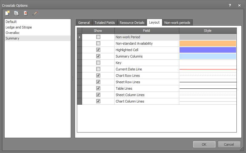 Select this feature to display periods when the availability of a resource is non-standard. If this field is selected, periods (currently this is in days) where an availability profile exists for the resource that differs from the default availability are highlighted using the format specified. |