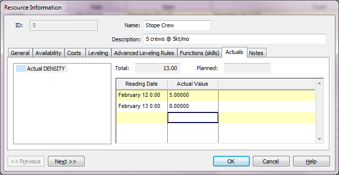 | List of production properties | List of production properties set up in the project that record actuals on resources. Select a value from the list to record actuals for that property. |