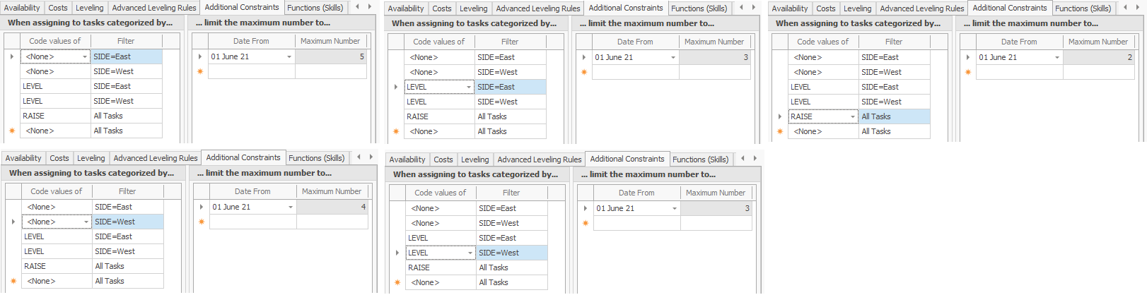 For the highlighted row in the screenshot above, the code field 'LEVEL' has possible values of 01, 02, 03, 04 and 05. The resultant constraints are: From 1 June 2021 onwards, a maximum number of 3 resources can be used for tasks where LEVEL=01 and SIDE=East, a maximum number of 3 resources can be used for tasks where LEVEL=02 and SIDE=East, a maximum number of 3 resources can be used for tasks where LEVEL=03 and SIDE=East, a maximum number of 3 resources can be used for tasks where LEVEL=04 and SIDE=East and a maximum number of 3 resources can be used for tasks where LEVEL=05 and SIDE=East. |