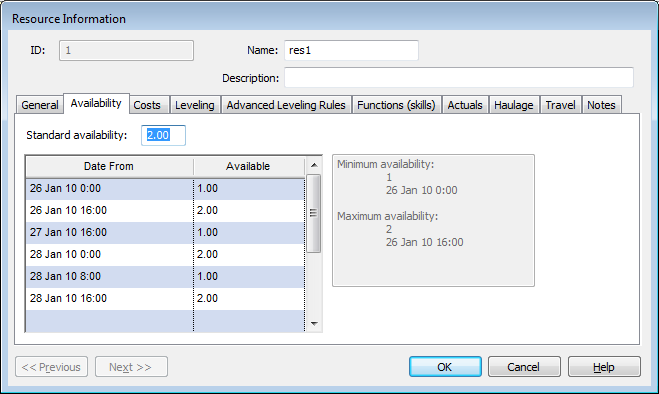 Each task has a single resource assigned (res1), which is set to Driving and working at a rate of 1t/d. The resource has an availability variation as shown in the following image.