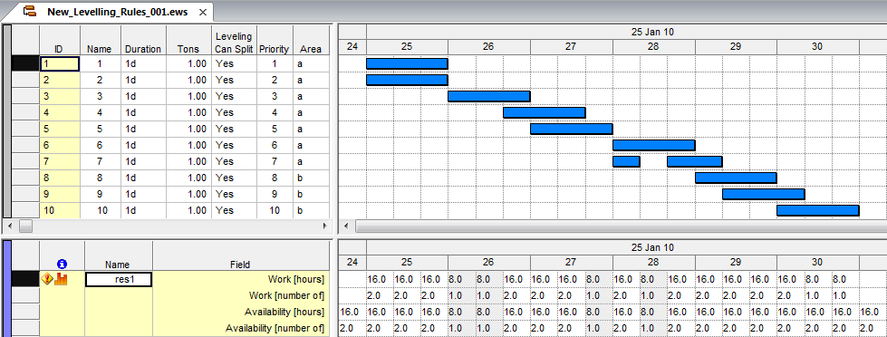 After leveling (using algorithm 1, viz. priority leveling) without the advanced leveling rules, the result would be the following.