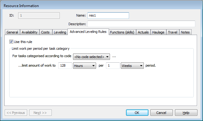 The advanced leveling rules allow you limit the amount of work a resource does in a particular time period, based on the category of task that the resource has been assigned to.