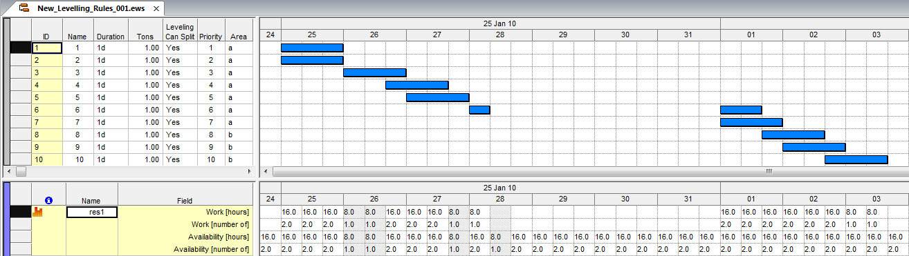 The result of the leveling process would be the following. Note that both area-a and area-b tasks start in the same period, as the work constraint now applies per area.