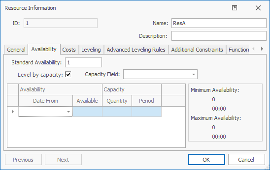 | Available | Specifies the percentage availability of the resource from this date. This field is used when leveling by number of resources, as well as capacity.