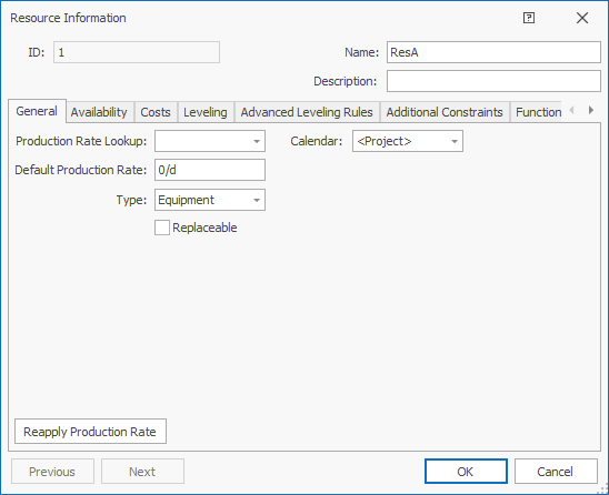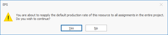 Reapply Production Rate Click to reapply the default production rate of this resource to all the resource assignments in you entire project. This is required if you change the default rate of the resource and wish to update this rate to all tasks that are assigned to this resource.