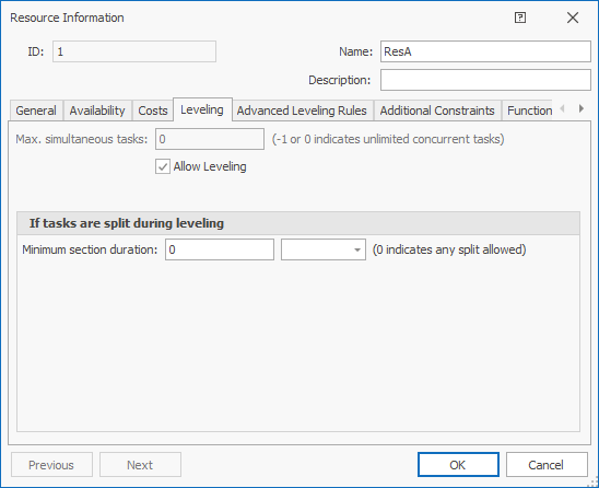 | Allow Leveling | If selected, this resource is levelled during the levelling process (i.e. tasks is delayed so that the resource usage does not exceed the resource availability). By default, this field is selected. |