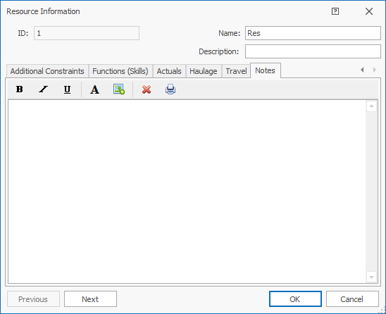 This option opens a screen that allows you to write notes regarding the resources, tasks, or projects depending on which screen you are using.