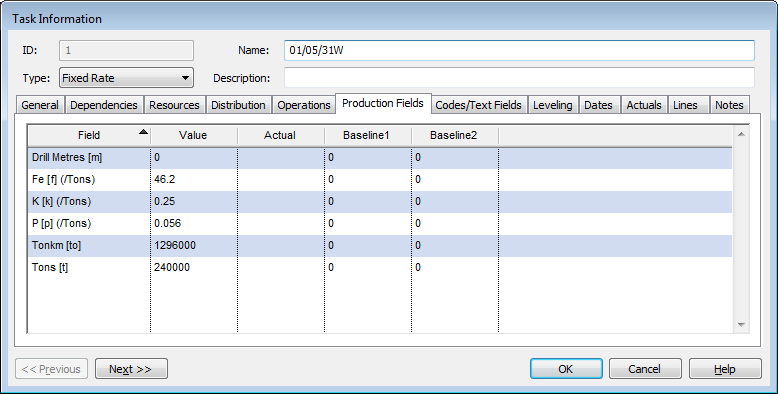 The Production Fields tab is used to display and edit all Production Fields associated with the task.