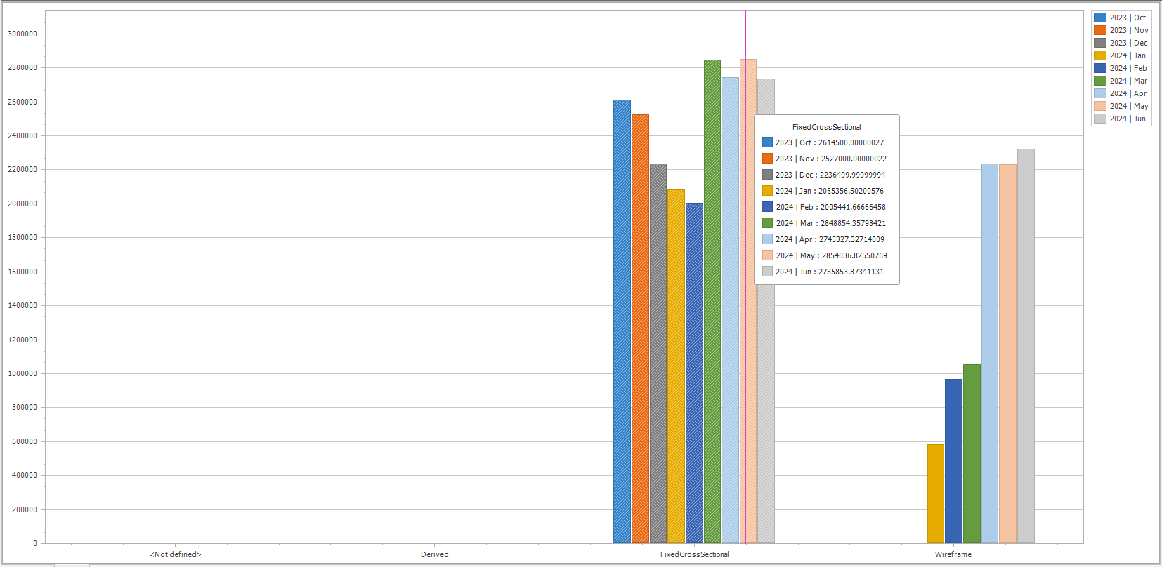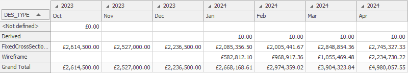 This can be useful to visualize results. For example, you want to show a histogram indicating total cost of operations for a particular design type, for 10 successive months, the pivot chart view's configuration area would look something like this:
