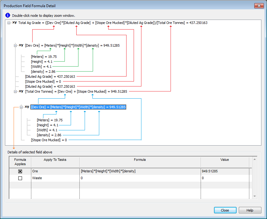 • Since a production field can have several formulas which apply to different tasks (specified by a task filter), the grid at the bottom of the form shows all the formulas for the highlighted row, and marks the formula that applies in this case. This is useful when debugging formulas.
