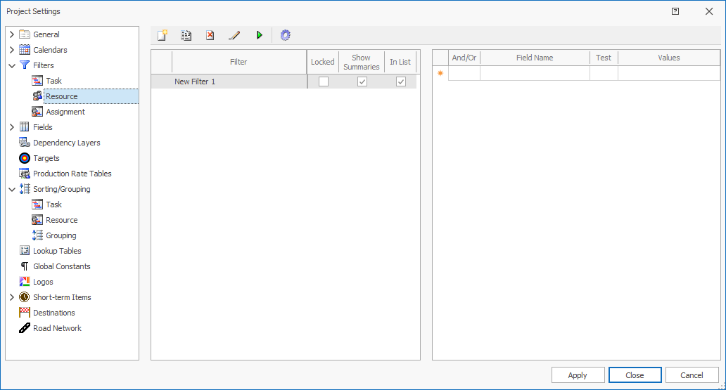 Click to insert a new resource filter. By default, new filters are called New Filter #, where # starts as 1 and is incremented by 1. |