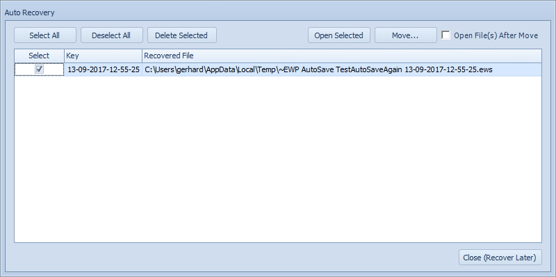 | Open Selected | Opens the selected backed-up file(s) directly; the file(s) will be located in the user's temp directory as specified by the "Recovered File" Column. The "Key" Column is a timestamp as to when the backup occurred. Timestamp format: DD-MM-YYYY-HH-MM-SS. Once opened user can decide what to do with the project. You must have at least one file selected in order to enable this button. |
