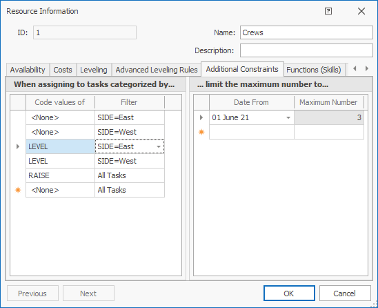 The additional resource constraints, to be applied during the leveling process, allow you to limit the number of resources, based on the category of task that the resource has been assigned to. The task category is determined by either a code value and/or a task filter.