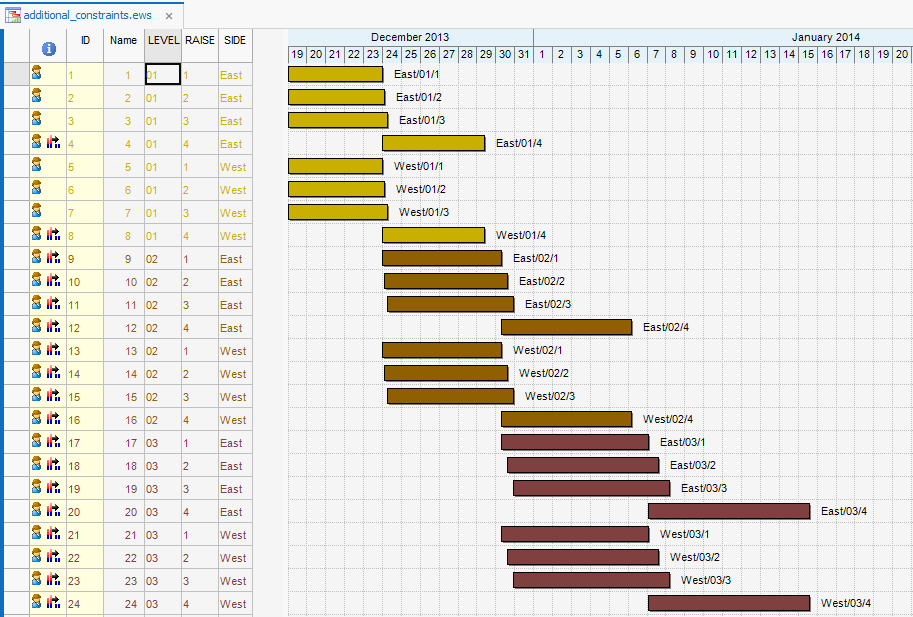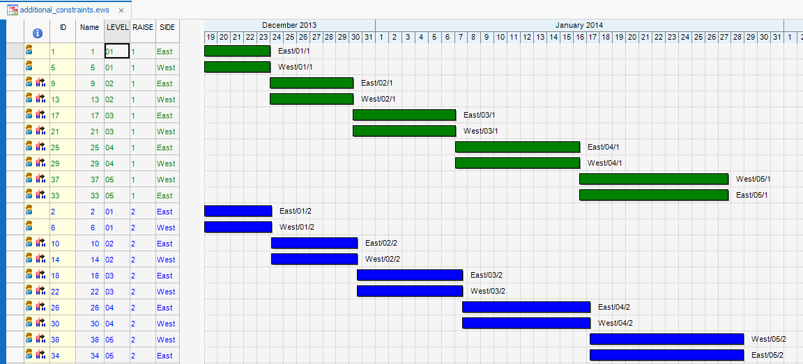 The result of the leveling process is shown below. In this screen tasks are sorted and colored by LEVEL. The result highlights the constraint rule whereby no more than 3 crews are allowed to work concurrently on each LEVEL per SIDE.