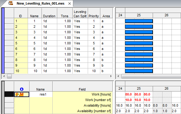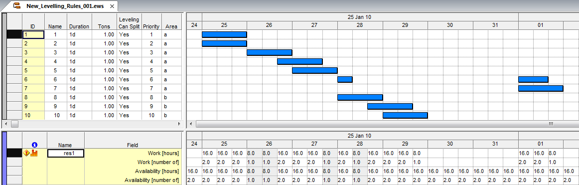 After leveling (using algorithm 1, viz. priority leveling) without the advanced leveling rules, the result would be the following.