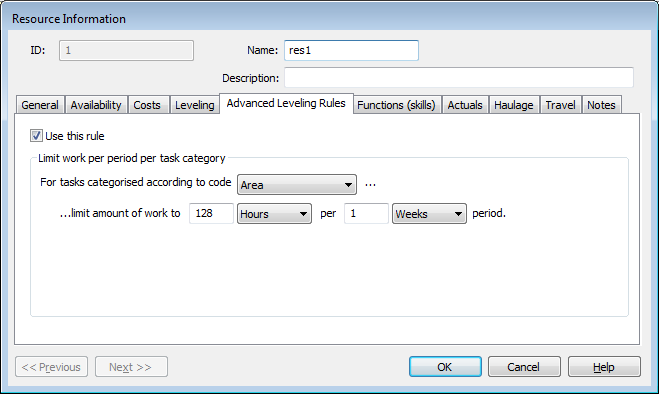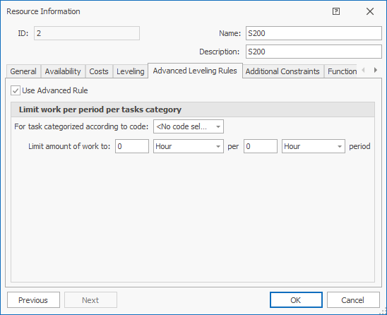 The advanced leveling rules allow you limit the amount of work a resource does in a particular time period, based on the category of task that the resource has been assigned to.
