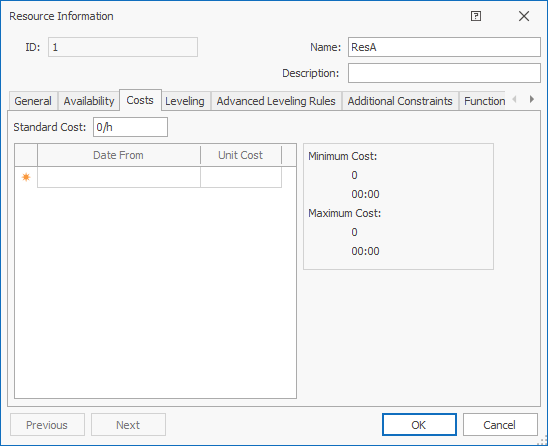 | Standard Cost | Specifies the standard cost of the resource per unit of time, such as cost per day. |