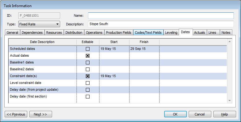 The Dates tab is used to list all the standard date fields for this task.