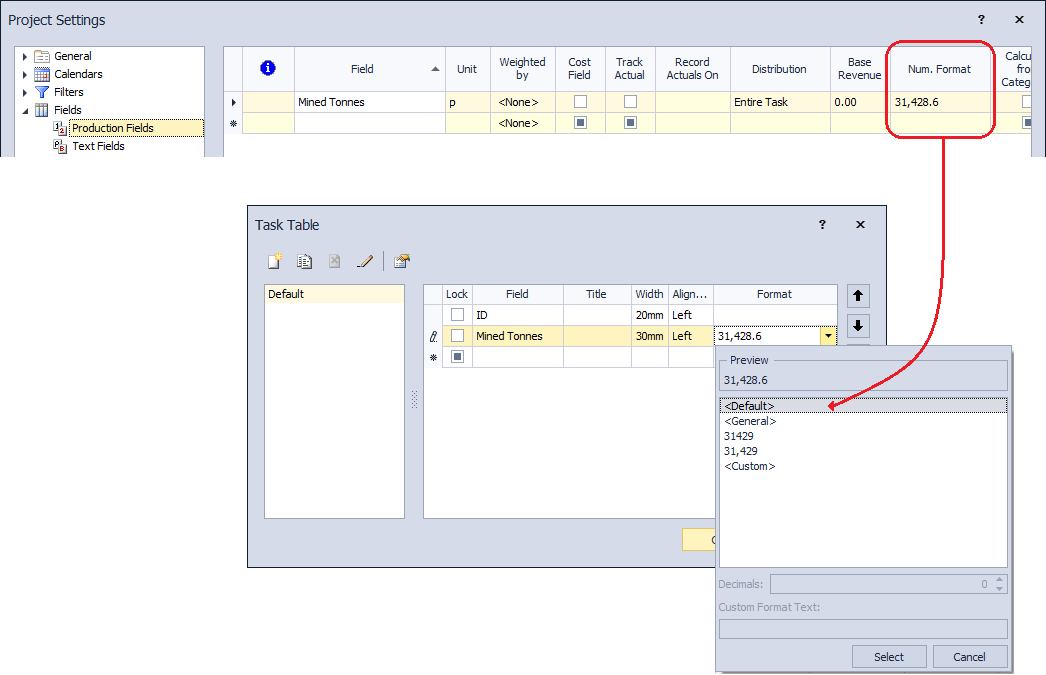 Production fields are defined in the Project Settings form, and the format specified here is considered to be the <Default> format. This means that if you use a production field in a task table and select the <Default> format option, the format specified in Project Settings is used (as shown in the figure above). Alternatively you can select one of the following options (for numeric fields):