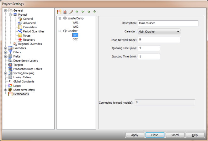 The destinations can be configured in a hierarchy (e.g. C01 and C02 below Crusher). This allows the user to assign the generic destination (Crusher) to a task and allow the system to use the most appropriate child destination (s) depending on the travel distance and calendars.