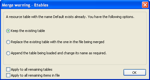Select the options that you need and click OK. This warning displays for each table that has changed.- The Merge warning - for example the tables screen displays: