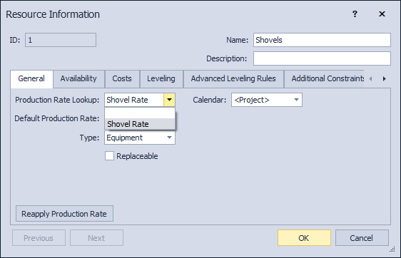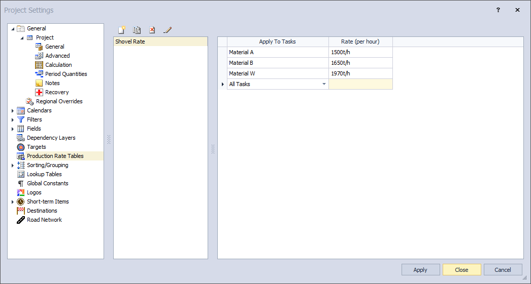 Production rate tables are used to set the default production rate for driving resources when assigned to tasks. Often certain equipment (e.g. shovels) can achieve different production rates depending on the material they are assigned to. The rates must be defined on an hourly basis, as the effective rate will depend on the calendar of the task that the resource is assigned to. The duration of time units larger than hours are dependant on the calendar of the task (and/or resource depending on the options).