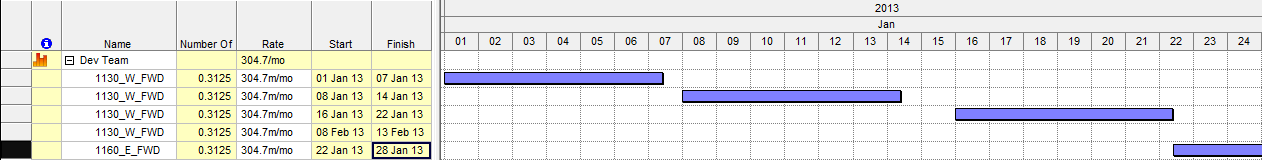 The Cross Tab view is replaced with the Resource Bar Chart showing the list of resources with the assignments for each resource, for example: