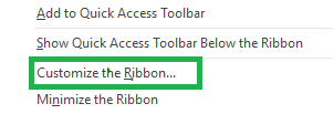 Right-click on the ribbon and select the Customize the Ribbon... option from the context menu.