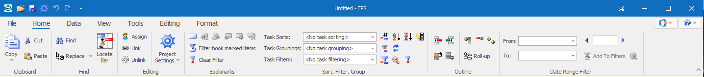 The DTS ribbon system is the primary interface that contains all DTS commands and feaures. Features are organised into a series of Tabs, each of which contains multiple commands that are logically sub-divided into Groups. The ribbon is located across the top of a schedule and replaces the old Toolbar interface.
