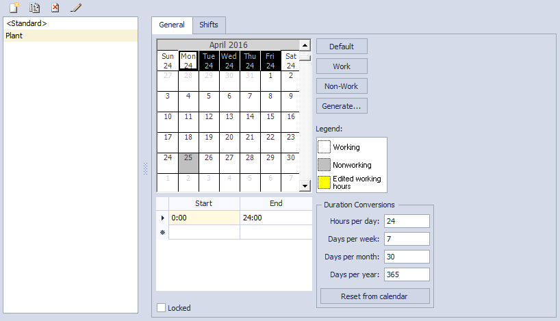 - Specify the working times for the selected days in the Shift start / end fields of the grid below the calendar grid. You can specify multiple periods in the grid in additional rows, e.g. 0:00 to 12:00, 14:00 to 24:00