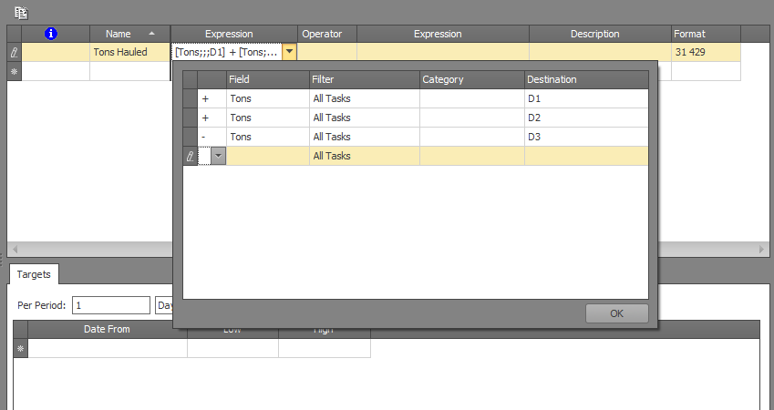 Each summary field supports either one expression (made up by one or more production fields combined with task selection based on filter, material category and destination), or the ratio of two expressions. The ratio (/) operator can, for example, be used to define stripping ratios.