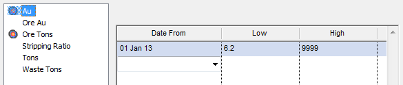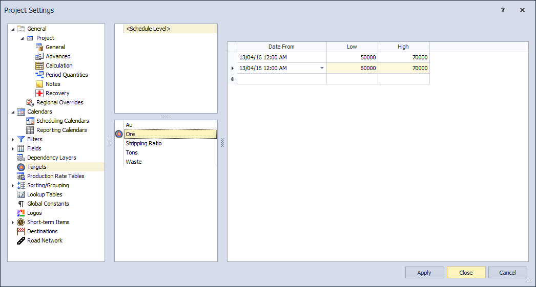 In order to enable production planning, it is useful to set targets on specific critical production fields. The targets have minimum and maximum values and can be displayed in the Crosstab (generally through coloring period values for the properties). The targets can vary of time by adding multiple records with effective dates specified in the Date From field.