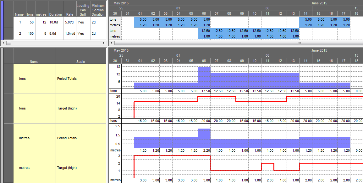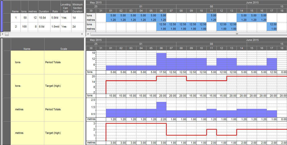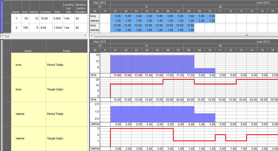 The bar chart Crosstab values show the tons (and corresponding metres) that will be extracted by each task. The red graphs indicate the ton and meter targets. Red numbers on the tons and metres histograms indicate days where the targets are being exceeded. Note the columns "Leveling Can Split" and "Minimum Section Duration" in the task table. These settings will have a significant impact on the resulting schedule.
