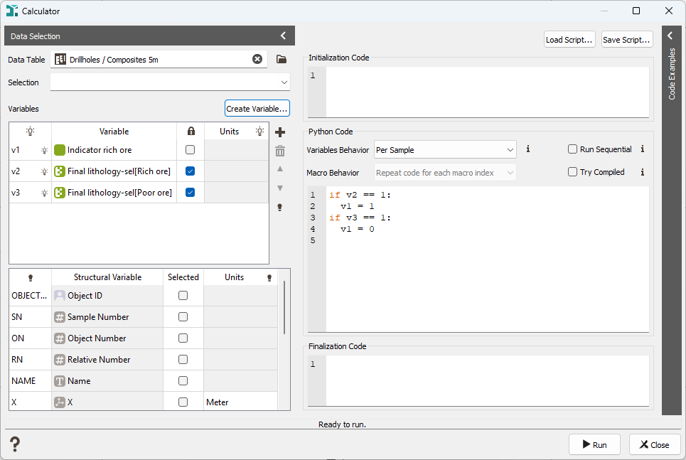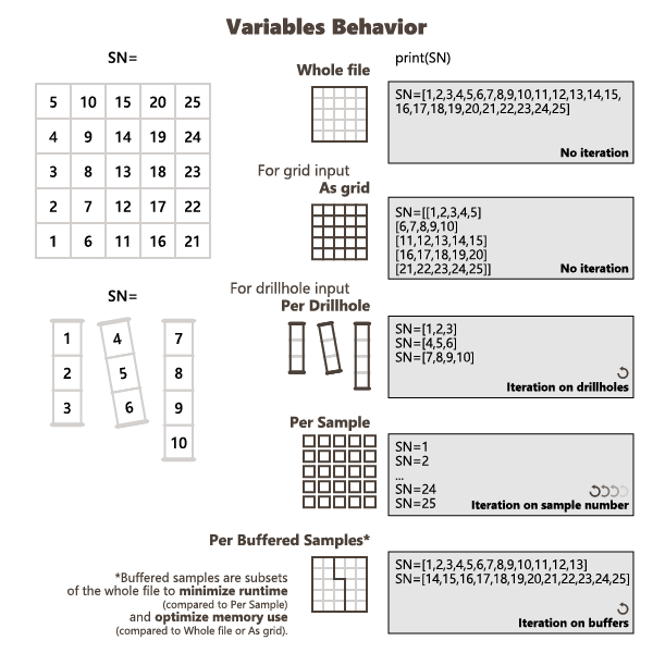 - Per Borehole: This mode is only available for Borehole Data Tables. It will process the sample of one borehole at a time. The code will receive the values of one borehole in the Numpy arrays corresponding to the selected variables. This mode allows the computation of some operation over all the samples of each borehole, like smoothing, completion,...
