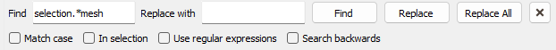 Check the Use regular expressions option to define a pattern you are searching rather than an exact string. You can search strings beginning with "selection", continuing with anything else and ending by "mesh", by using "selection.*mesh". The main expressions are: