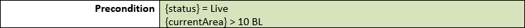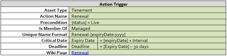 To specify preconditions, in the Action Trigger table, enter the Precondition criteria. For example, most tenement actions are only applicable for live tenements, this is reflected as: