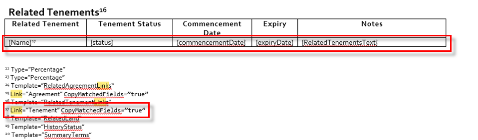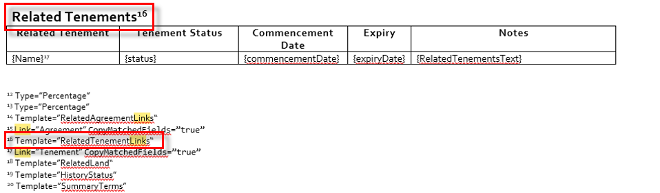The section titled Templates includes the scope of the template. LandTracker reads this to determine which tenement types are applicable to this template. It is not recommended to change this section.