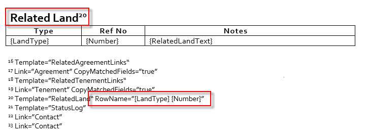Specifying a naming convention for created records using the RowName command. This needs to be set on the table heading endnote. By default, if the RowName is not specified, the naming convention will be [Table Heading] [Value of 1st field in table]. For example, Related Land Juna Downs.