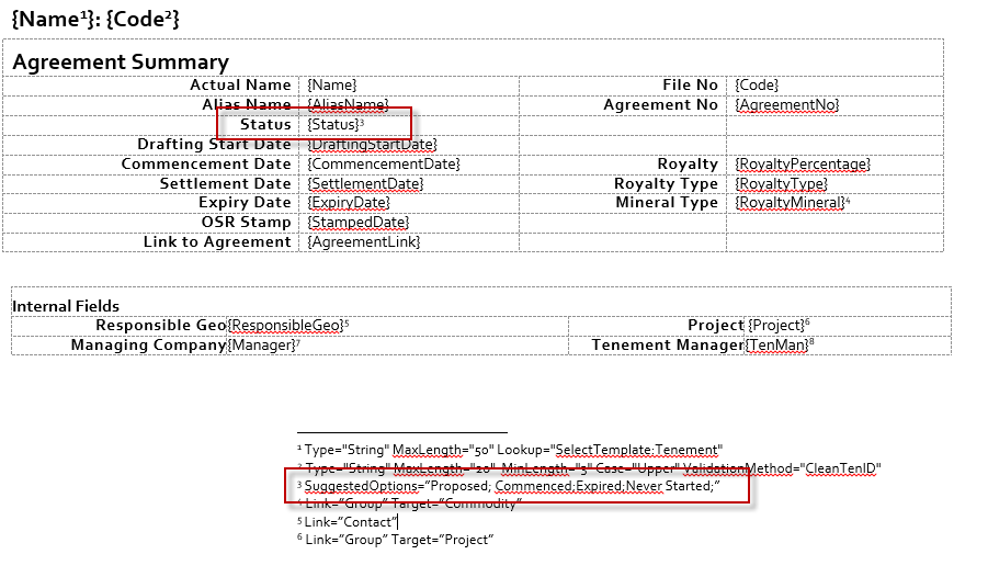In default templates, we have created field property references that are used by LandTracker to identify when certain fields should have additional properties attached to them. Use Microsoft Word's Insert Endnote tool to create your own field properties.