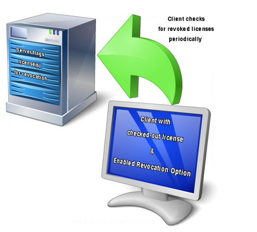 If the licensing client detects that a checked-out license has been revoked, the check out of that license is cancelled and the license becomes available again on the server.