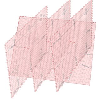 A section definition stores section parameters. One or more sections can be stored in an object or file, for example, a mixture of sections in varied orientations showing key zones within a reserves model, like this: