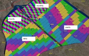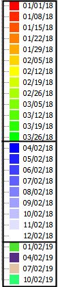 Locate the new legend and expand it to review the new legend date intervals. Following the example above, you would see 12 weekly intervals transitioning from red to green, followed by 9 monthly intervals cycling from blue to white, followed by four intervals representing quarters, randomly coloured:
