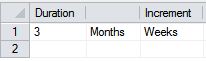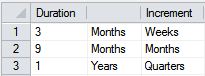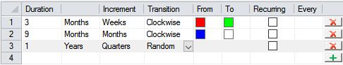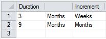 Continue to add rows, where a new row is required wherever the time unit or Increment changes. For example, you could add a third row representing the 2nd year in quarters: