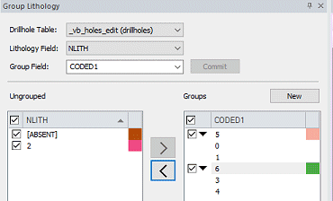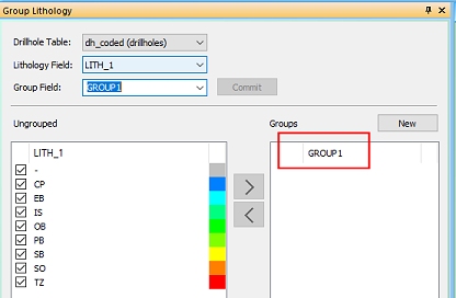 Selecting an existing Group Field and clicking Commit will update the panel to show the defined group values on the right (the Groups table), and the lithological values each group contains.