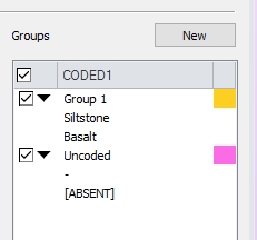 For example, an NLITH attribute contains multiple lithological values as numbers (0-4) and is selected for the Lithology Field. A Group Field with an alphanumeric description "CODED1" is created (this is the new attribute name that will be applied to the object), but each group that is created within it must be numeric, and in this case, be a number greater than 4. Creating a New group within the Group Field will automatically apply the value 5. You can add NLITH values to the '5' group. Creating a new group uses the default label '6' and so on.