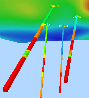 This approach allows you to format a selected overlay for a drillholes object whilst retaining the formatting of other overlays. This can be useful, for example, if you wanted to compare an overlay of a drillhole table without grouping (e.g. colored using the native lithological field) against a grouped overlay of the same object (e.g. colored using the Grouping Field).