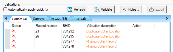 Where possible, and if the solution is obvious, Drillhole Importer can fix errors during the validation stage so that, the next validation run removes all the solvable problems, leaving others to be actioned using one of the options available.