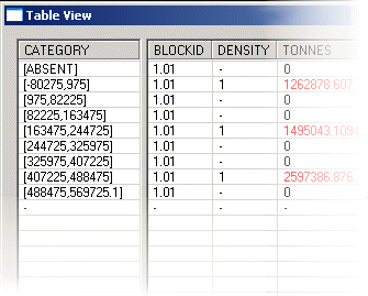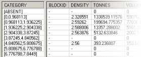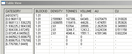 The read-only Table View dialog quickly analyses all currently selected string data, and makes the necessary projection(s) to define the relevant evaluation volume(s). Once this has been calculated, the cells falling within the evaluation zone are analysed in relation to all of the important fields selected in the Dynamic Evaluation Settings dialog. Results for TONNES and VOLUME will always be displayed alongside the relevant BLOCKID. If additional fields were selected for evaluation, such as PHASE, SEQUENCE, VALUE, average AU grade etc. these will also be shown for each table record: